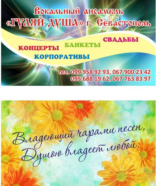 Вас приветствует профессиональный вокальный ансамбль «ГУЛЯЙ ДУША» г. Севастополь. Мы работаем по всей стране и за рубежом. Сотрудничество с нами – это выгодный и качественный праздник, юбилей, корпоратив, свадьба, концерты любого уровня, на любых площадках и удовлетворение самого изысканного клиента.