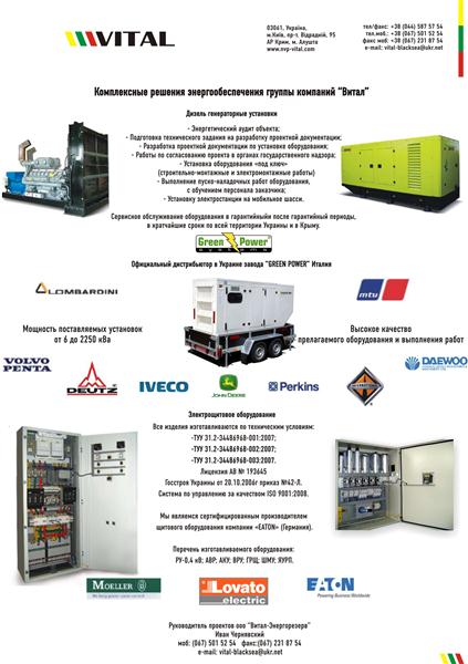 Группа компаний «ВИТАЛ» является официальным представителем итальянского завода по производству дизельного оборудования «Green Power» и предлагает генераторы с двигателями мощностью от 10 до 2500 кВА от ведущих европейских производителей, таких как: