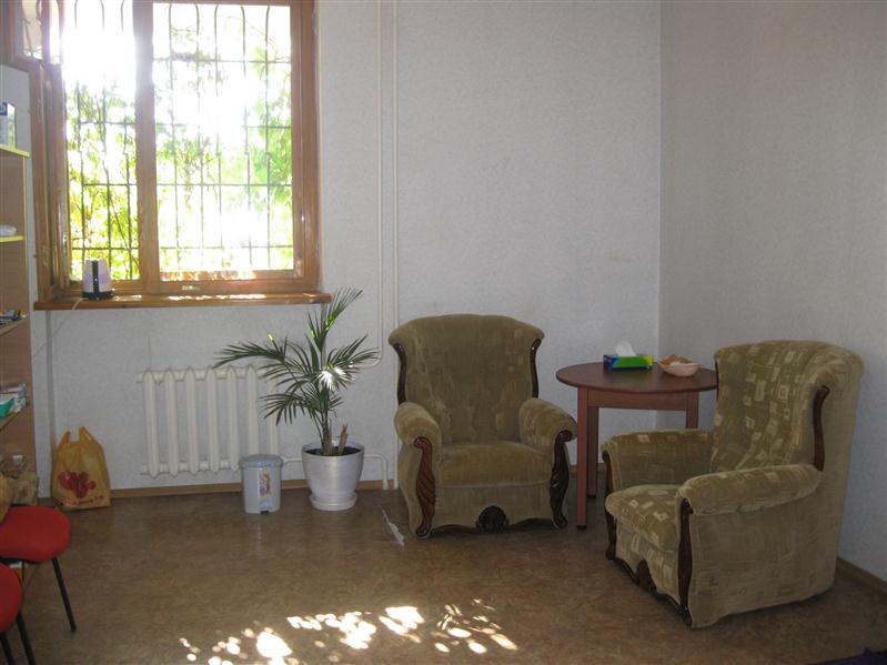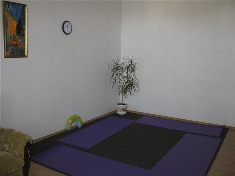 Полностью пригоден к работе как с индивидуальными клиентами, так и с группами: 2 мягких кресла, круглый стол, 2 офисных стула, ковролин, карематы, шкаф с полками, 2 напольных цветка и т.д.