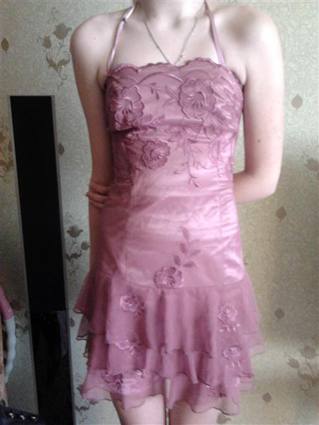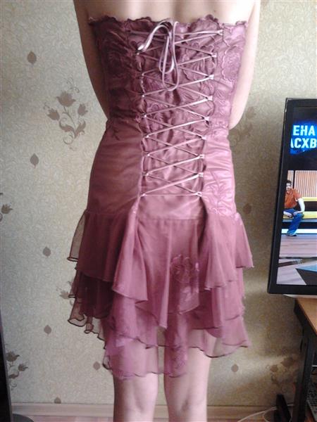 платье короткое,из атласа покрытого гипюром,сзади шнуровка,сливового цвета,размер S.