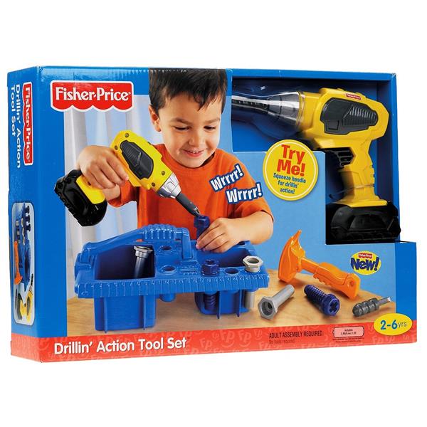 Детский набор инструментов мастера для мальчиков от ФИШЕР ПРАЙС от 2 до 6 лет. В наборе инструментов шурупы, гвозди, электрическая дрель с двумя насадками и переносной контейнер в котором хранится и переносится все богатство маленького мастера. Хотим обратить особое внимание на электрическую дрель. Она работает от батареек и при нажатии на кнопку сверло крутиться и жужжит. ВВерху переключается направление вращения для вкручивания и выкручивания шурупов, так что будет интересно не только малышу но и папе. Сверло вынимается из дрели и меняется на отвертку. Инструменты из качественного пластика, поэтому завинчивать и забивать, как папа, одно удовольствие. Цена 250,0 грн.