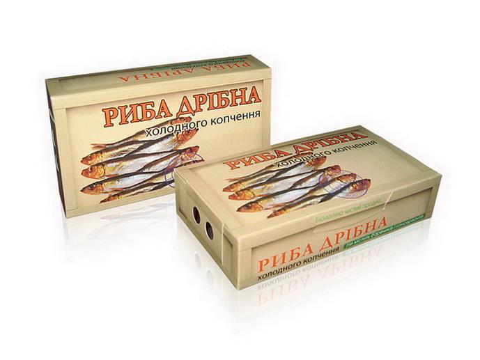 Картонная упаковка для мелкой рыбы от производителя с использованием технологий офсетной и шелкотрафаретной печати, горячего тиснения металлической фольгой и конгрева, ВД и УФ лакировки, высечки и склейки. Материал – целлюлозный либо макулатурный картон с внутренней ламинацией для защиты упаковки от воздействия жира и масла.