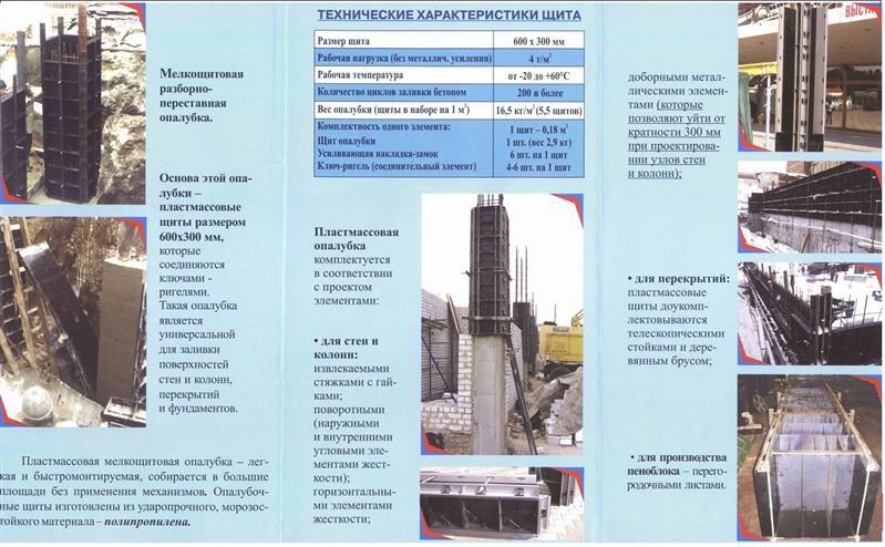 Форма состоит из щитов с рёбрами жёсткости, изготовленные из полипропилена (ударопрочного, кислотостойкого, морозостойкого). Надёжное соединение щитов, как в одной плоскости, так и под углом, осуществляется с помощью специальных ключей-ригелей. Они не только прочно соединяют щиты, но и выравнивают их между собой. Из-за упрощенного монтажа кассеты трудозатраты очень снижены. Вес пластиковых щитов 16,5 кг/м.кв., что позволяет сборку производить без дополнительной техники.