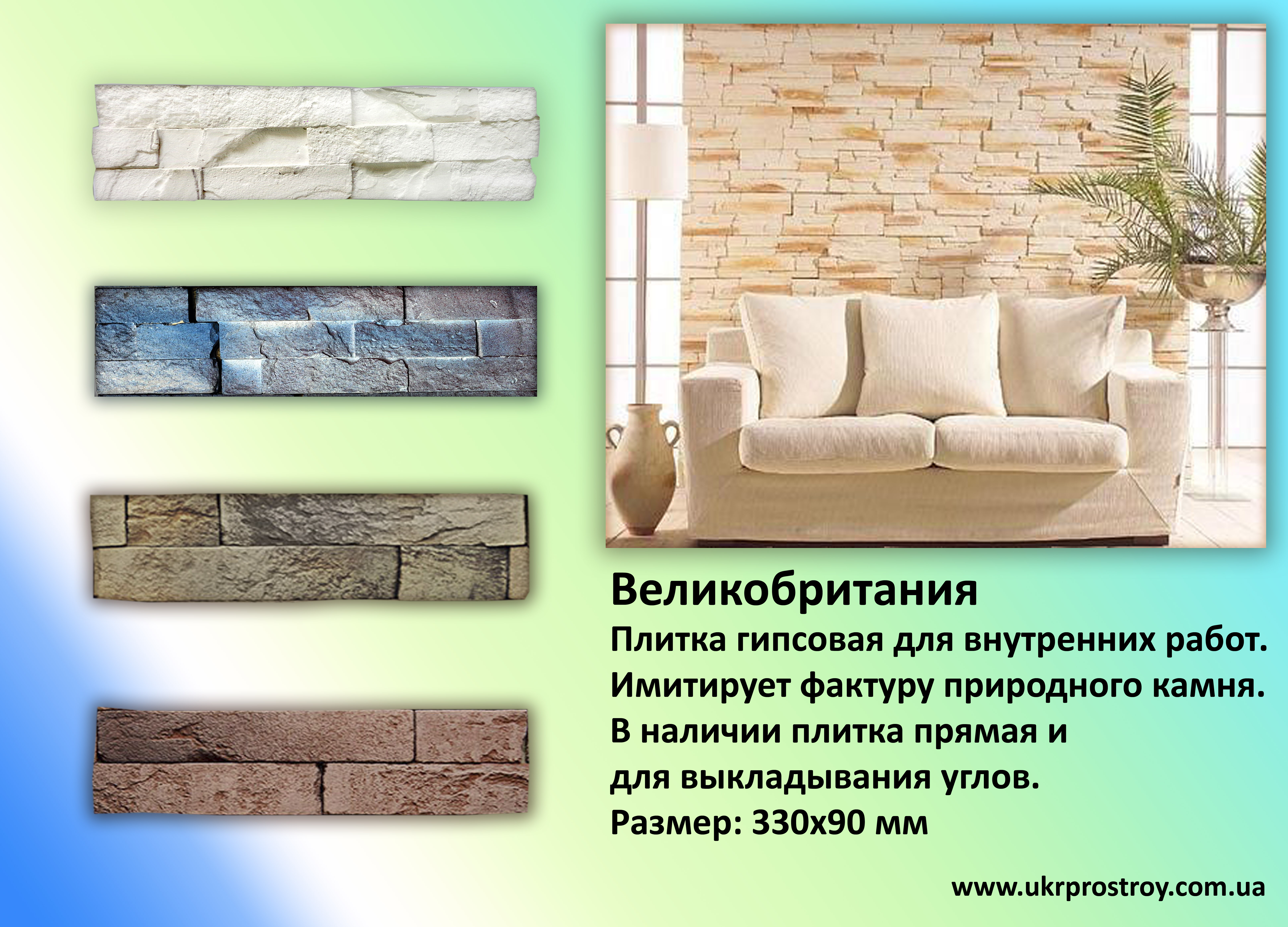 Укрпрострой предлагает огромный выбор интерьерной гипсовой плитки самых разнообразных оттенков и видов в зависимости от целей и задач внутренней отделки помещения.