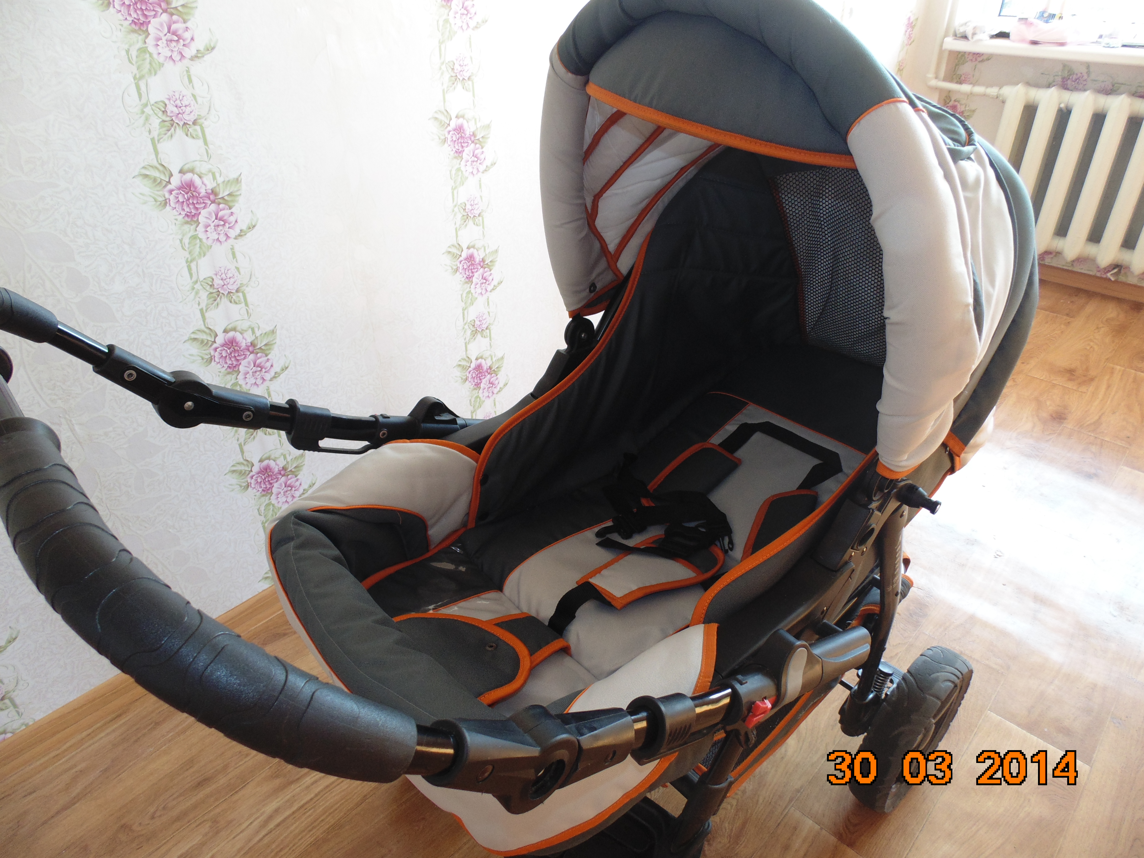 Прогулочный вариант - пристегивается защитный бампер, спинка имеет 3 положения (лежа, полу сидя и сидя). 5-точечные ремни безопасности. Под ножками можно опустить, чтобы сидя ехал, либо поднять, пока спит (обернуто клеенкой, чтобы не пачкалось от обуви).