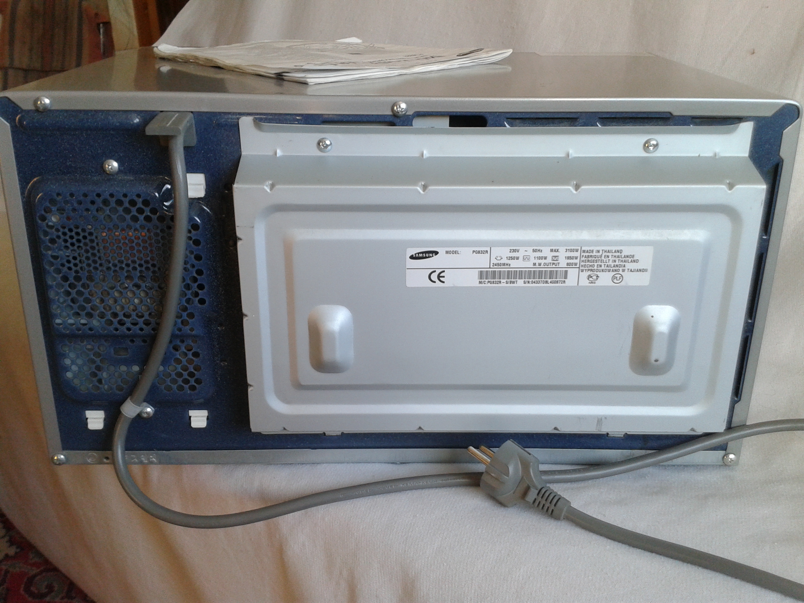продам Микроволновая печь SAMSUNG PG832R made in THAILAND, с двойным грилем объемом 23 л, мощность микроволн — 800 Вт, мощность гриля — 1850 Вт, тип управления – сенсорный. Модель имеет 7 уровней мощности, 3 режима авторазогрева, 3 режима авторазморозки, 8 режимов автоприготовления в режиме Super Grille, таймер, часы, блокировку от детей, удобную клавишу для открывания дверцы, покрытие из БИО-керамической эмали, сигнал окончания работы, кнопку “Быстрый старт”, кнопку “Вентиляция”. При использовании режима автоматического приготовления SuperGrille продукты поджариваются одновременно с обеих сторон. Для большего удобства разработаны различные программы автоматического приготовления в режиме SuperGrille: стейки, кебаб/шашлык, куски курицы, куриные грудки, жареная рыба и рыбное филе, горячий тост и другие. Цвет: серый металик, состояние идеальное