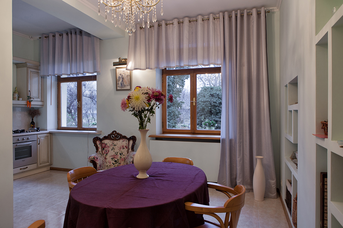 Квартира расположена на втором этаже трёхэтажного дома. Общая площадь составляет 110 метров. Просторная светлая кухня-столовая площадью 20 метров оборудована встроенной мебелью и техникой. Её окна выходят в тихий зелёный сквер с большими деревьями.