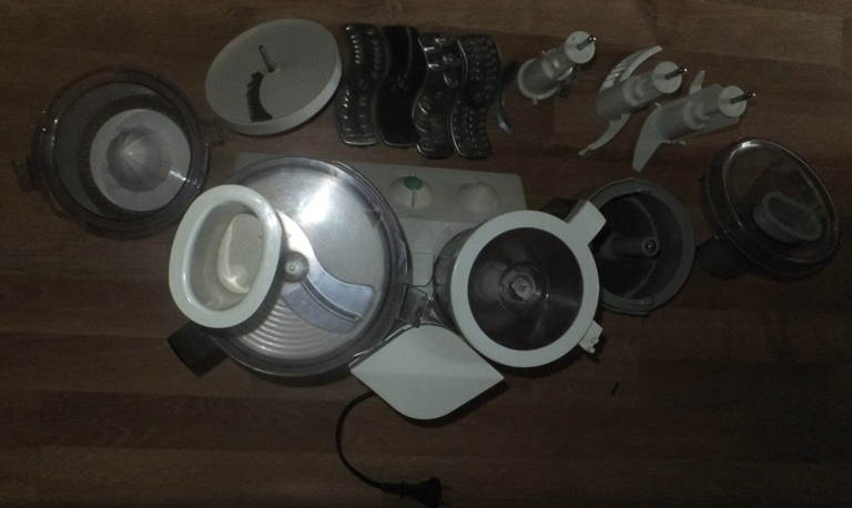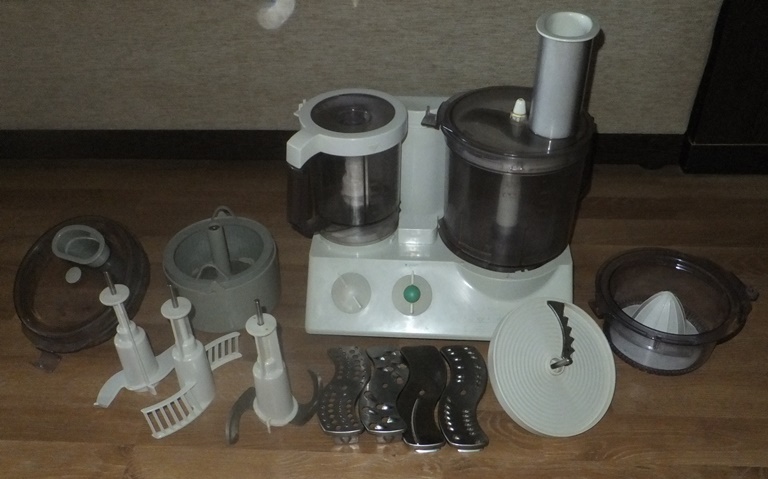 Насадки - универсальный нож, насадка для теста, насадка для взбивания, диск для картофеля-фри, терки - 3, диск для нарезки ломтиками.
