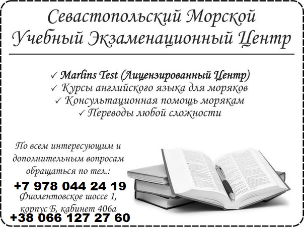 -Лицензированный Центр Marlins Test- у нас вы можете сдать Marlins Test, который будет принят во всех крюингах и у любых судовладельцев, так как мы являемся Лицензированным центром ( Approved Test Centre)