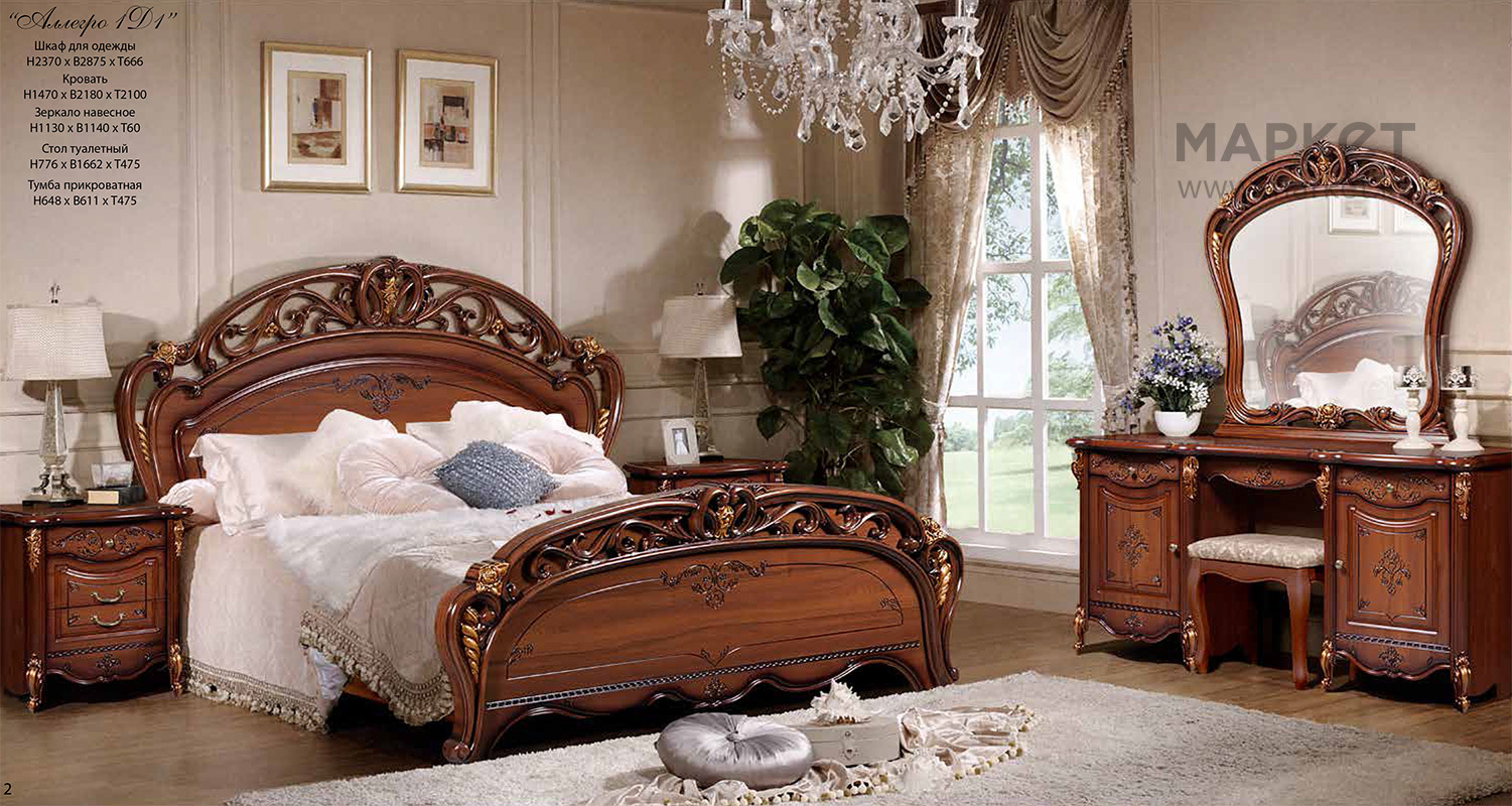 Классическая спальня Аллегро в цвете орех, с эффектом золотой патины Цена 109000 руб. Это точная копия Итальянской спальни Аллегра по вполне демократичной цене , с отменным качеством. Комплект Аллегро состоит из резной кровати 180/20 с ортопед основанием под матрас, 2-х тумбочек прикроватных, туалетного стола с зеркалом в оправе и шкафа 4-х дверного с 2-мя зеркалами. Доставка по Симферополю и Крыму. Сборка, гарантия качества!