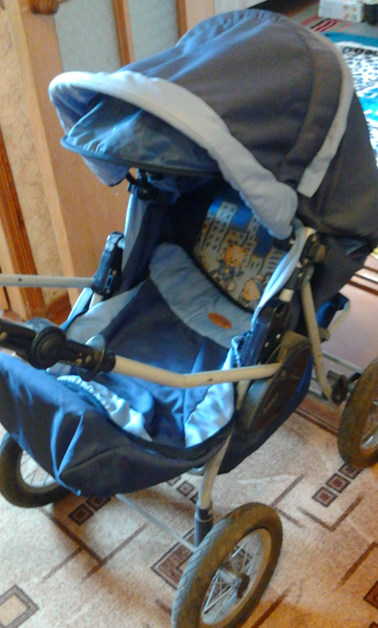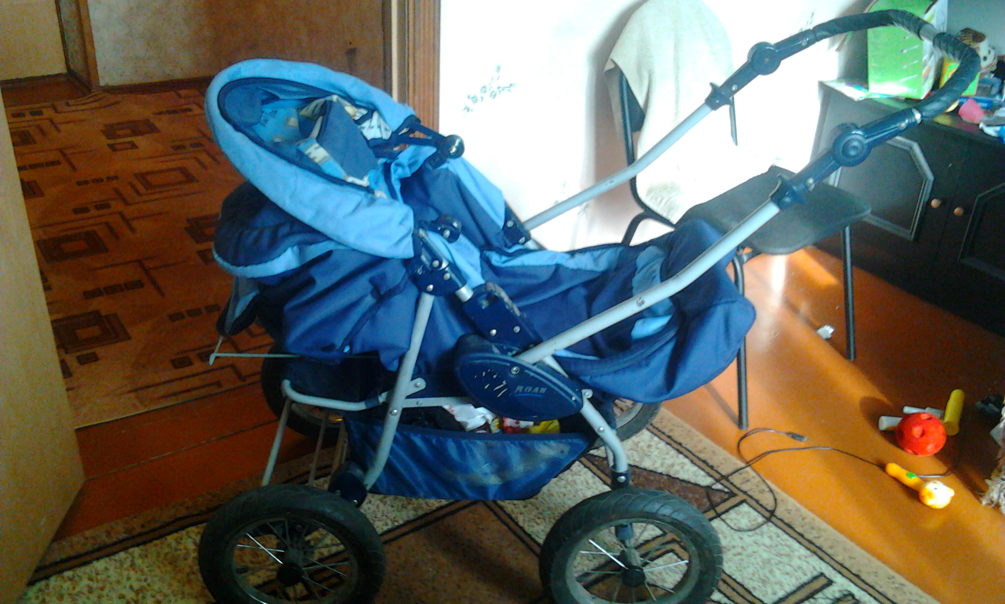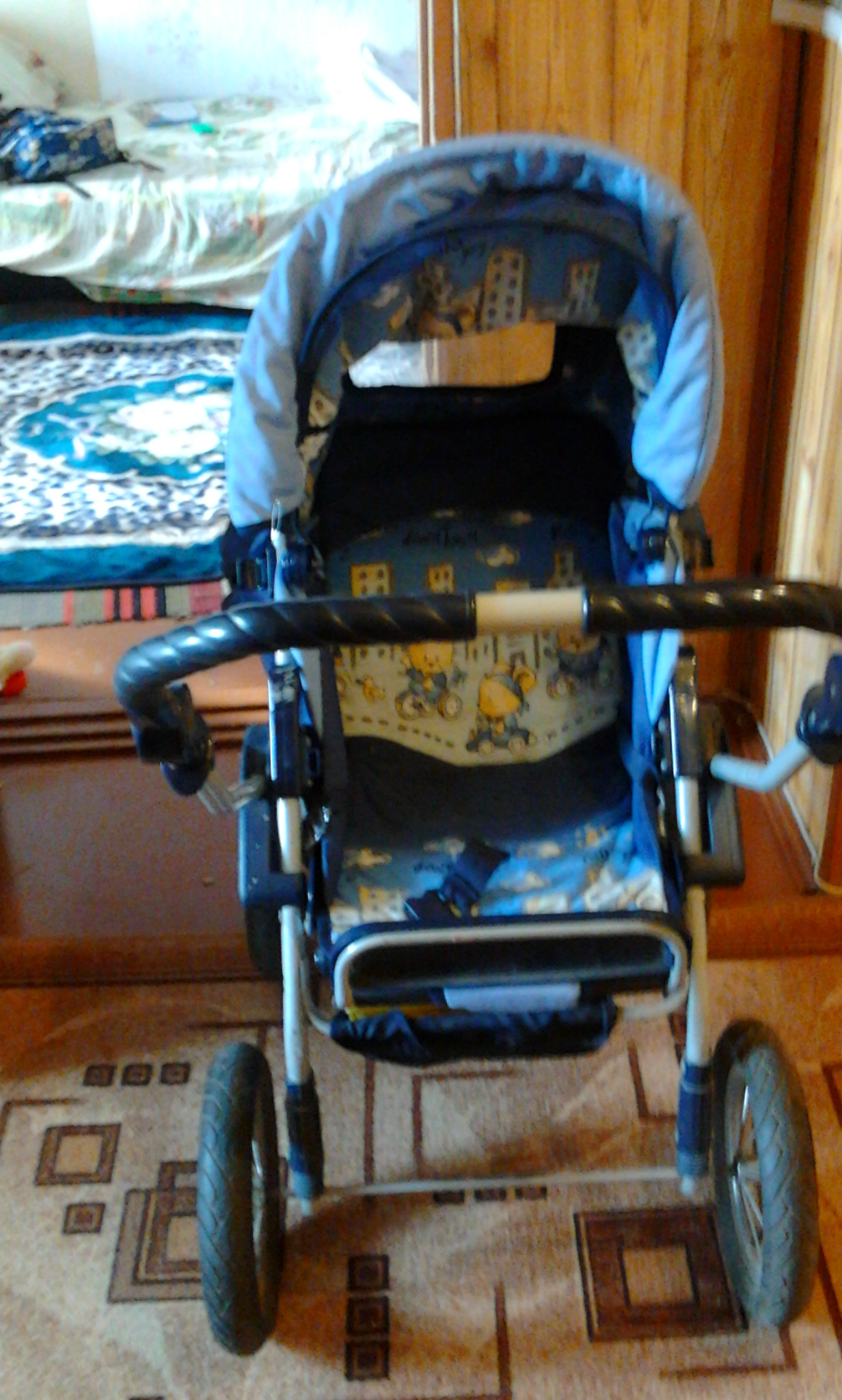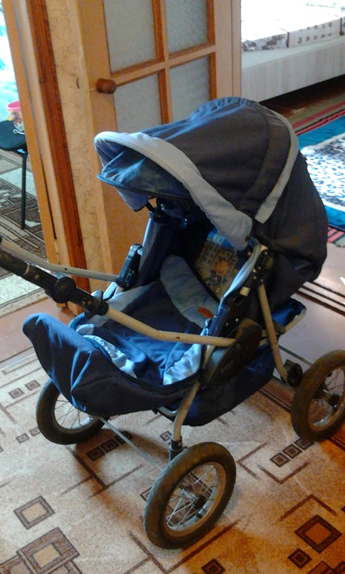 Универсальная суперская коляска. Очень удобная. Синего цвета. Ручка регулируется.Есть несколько положени.От рождения и до 3 лет и больше.й. Есть кармашек и внизу для сумки корзина. Колесы большие, любые ямки и бордюры не опасны.Торг возможен