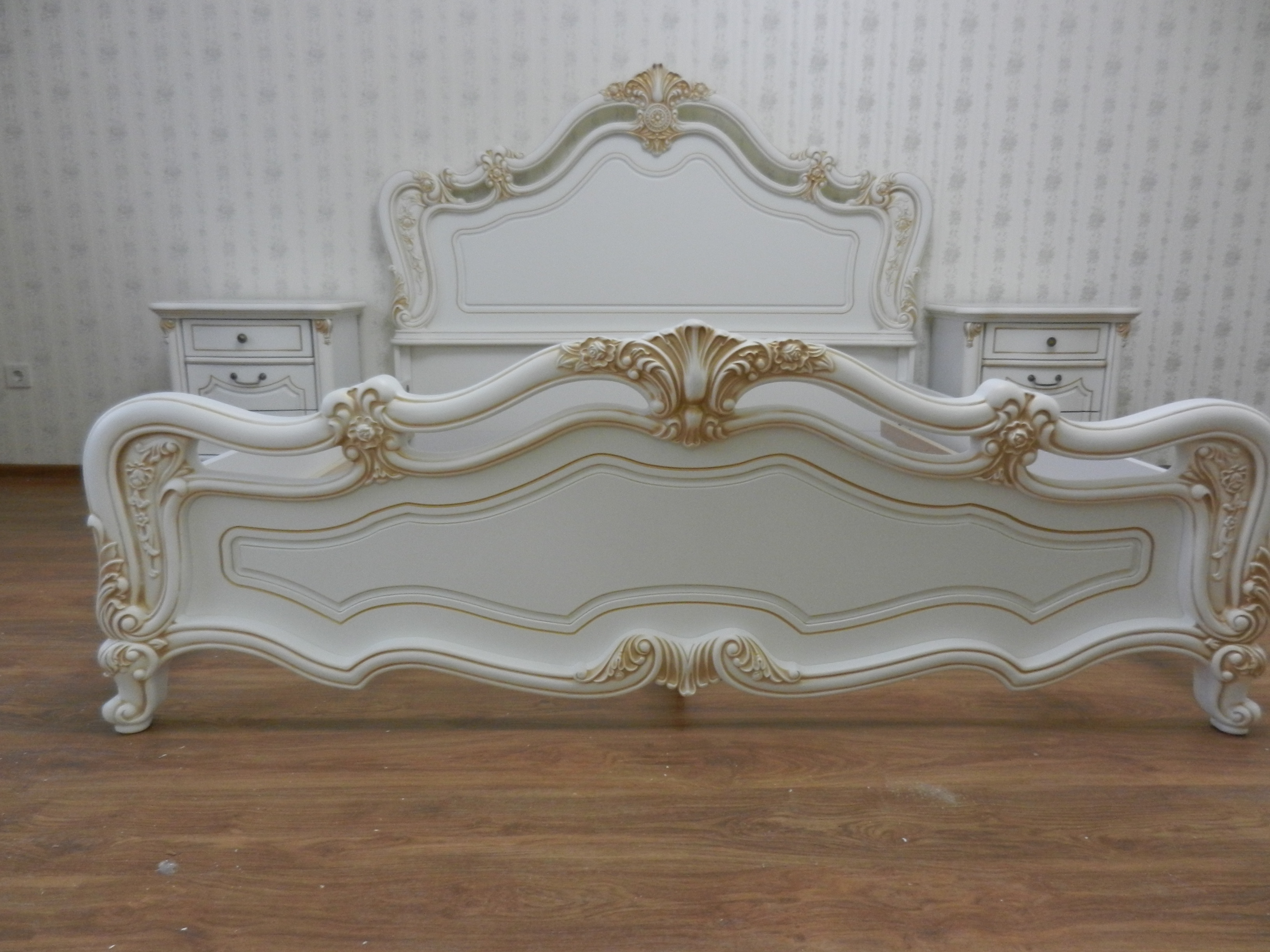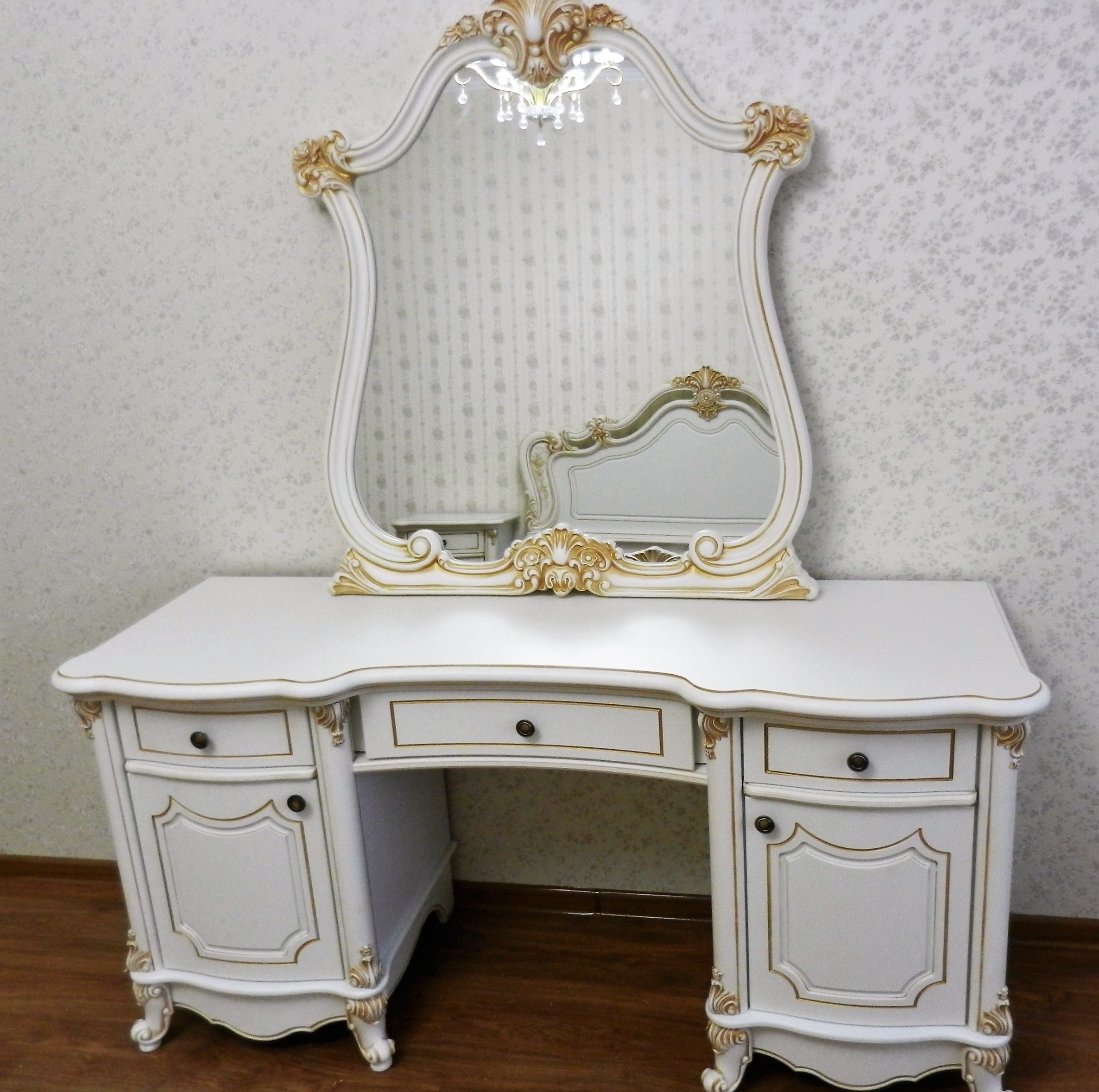 Спальный гарнитур Мона Лиза белая с патиной, состоит из кровати на 180, 2-х тумбочек прикроватных, стола туалетного с зеркалом в резной оправе и шкафа 4-дверного с 2-мя зеркалами. Цена 135000 руб. Доставка по Симферополю и Крыму, сборка, гарантия качества. +7978 744 10 20 mebelkrym.com.ru.