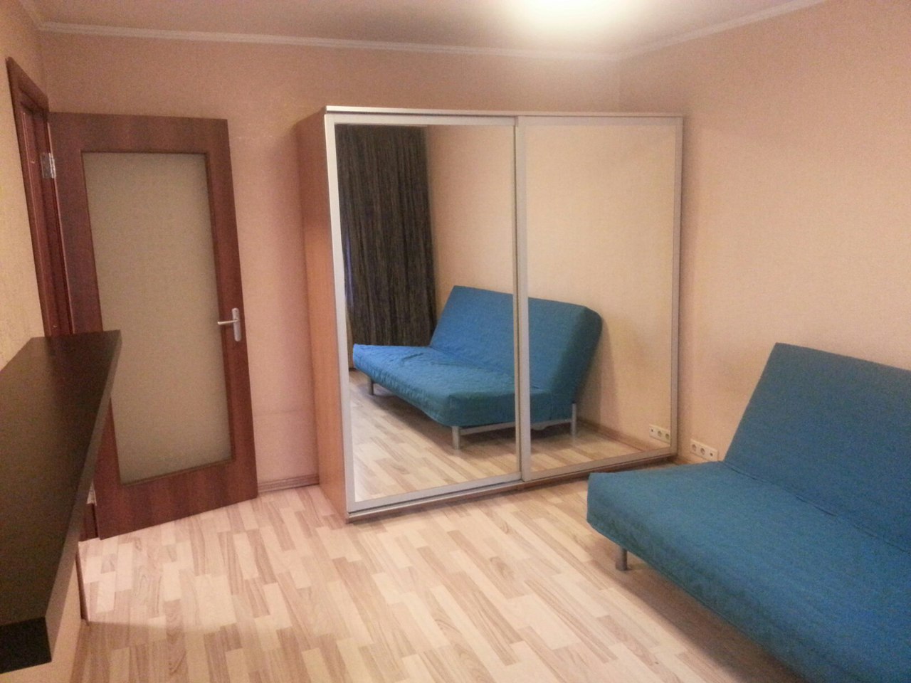 Современная мебель, телевизор, холодильник, стиральная машина автомат, микроволновая печь, электро чайник, двух спальный диван, зеркальный шкаф купе, ламинат, отличное состояние, на длительный срок.
