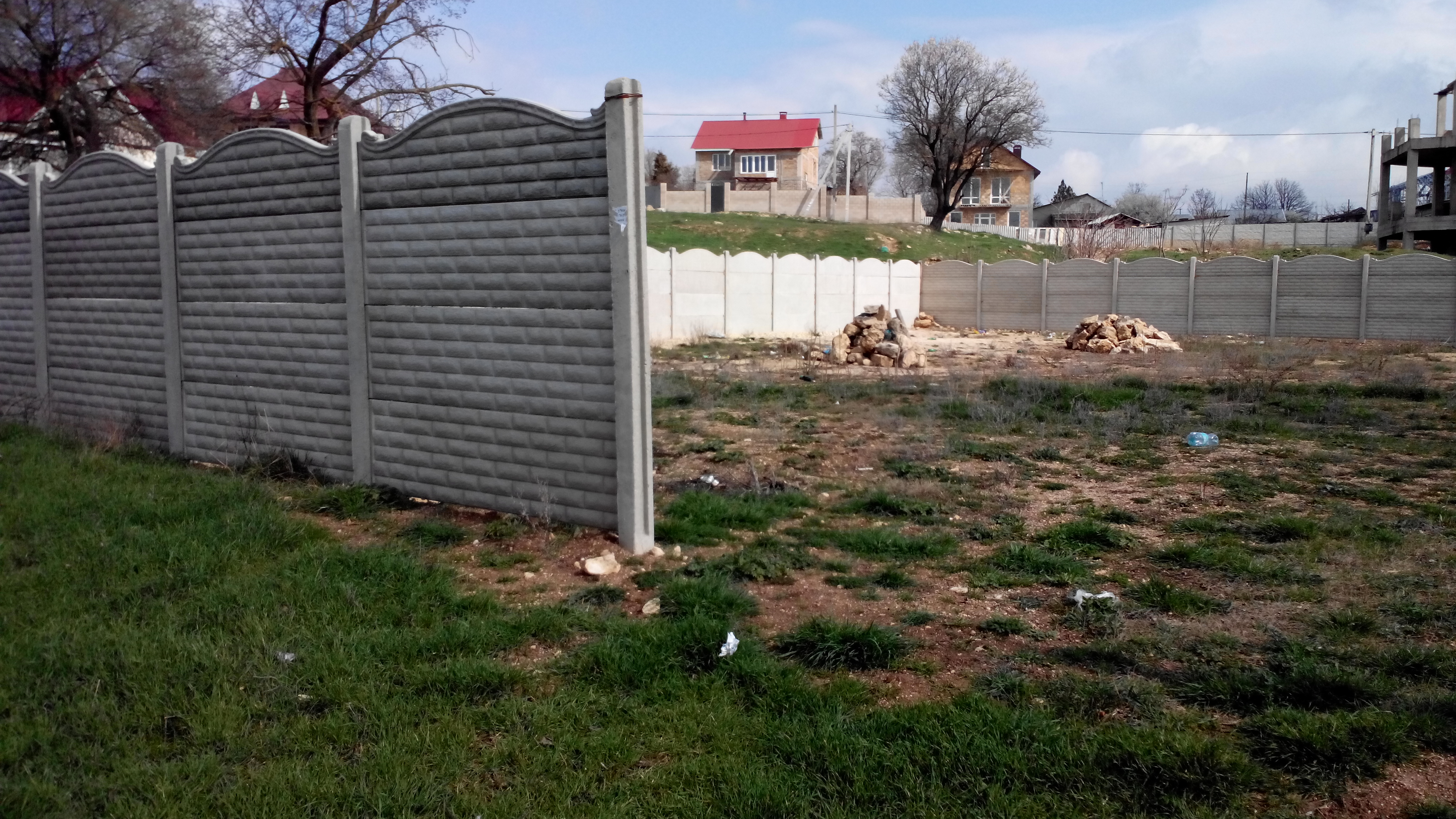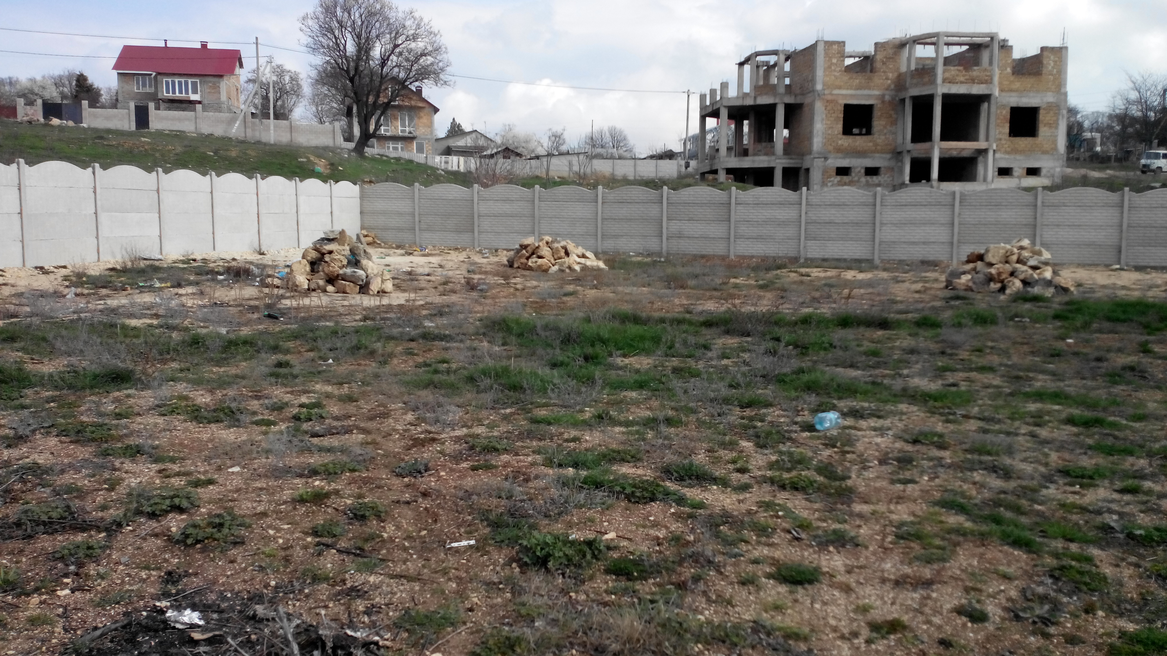 Прекрасно видно, что участок пустой, ровный, прямоугольной формы, огорожен заборчиком!