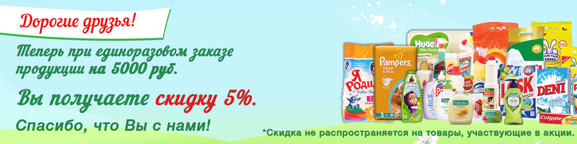 Теперь при единоразовом заказе продукции на 5000 руб. Вы получаете скидку 5%. Скидка не распространяется на товары, участвующие в акции.