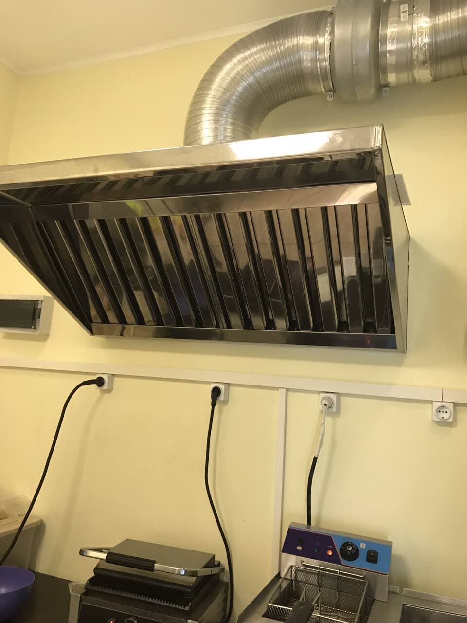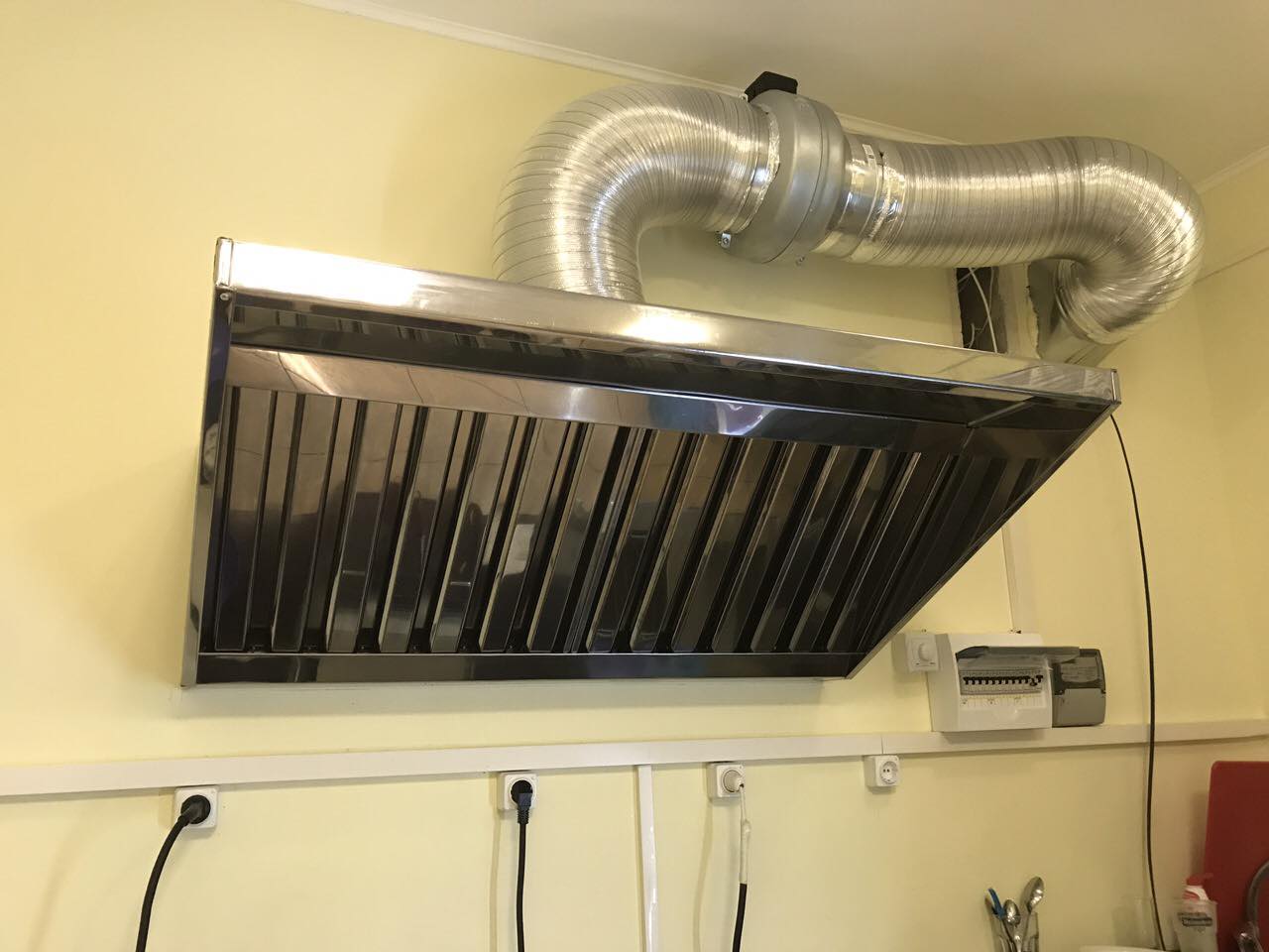 Выполняем качественный и профессиональный монтаж вытяжных зонтов из нержавеющей стали с жироулавливателями для кухонь кафе, баров, ресторанов и столовых.