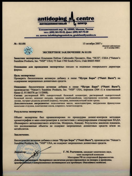 Nutri-Burn (США) имеет Антидопинговый сертификат!