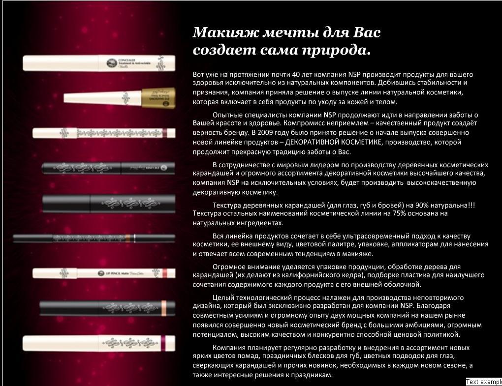 В сотрудничестве с мировым лидером по производству деревянных косметических карандашей и огромного ассортимента декоративной косметики высочайшего качества SCHWAN COSMETICS / Шванкoсметик (Германия), компания NSP на исключительных условиях , производит высококачественную декоративную косметику.