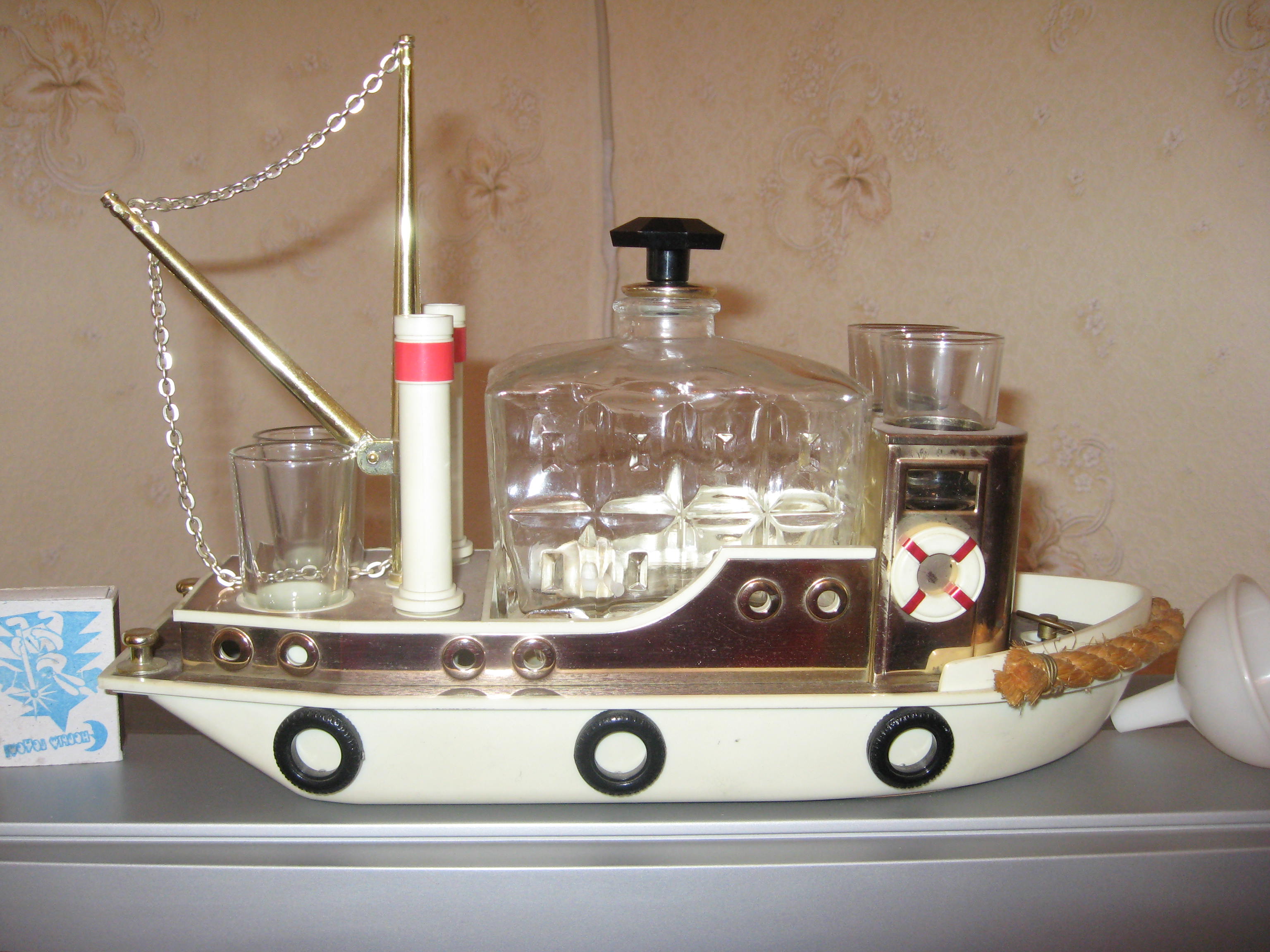 2 сувенирный корабль производства Японии,70егг ХХв,рубка представляет собой графин,на носу и корме-по 2 стопочки.На палубе находится рычажок для завода пружины-при поднятом графине играет музыка.лейка для заполнения графина в комплекте