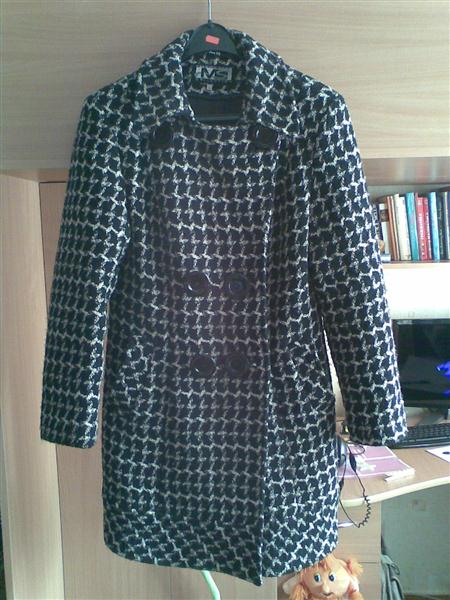 Virgin wool. Шерсть, утеплённое - синтепон, с поясом, который крепится под шлицу сзади на декоративные пуговицы и легко по желанию снимается. Спереди верхняя пуговица позволяет регулировать отворот. Два прорезных кармана. Жаккардовый узор: чёрный. белый, беж. Размер 50-52. 200 грн. 066-576-94-85