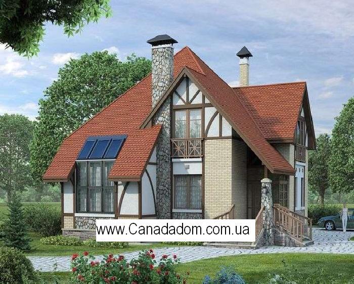В этом небольшом по площади доме удалось создать просторную, свободную и очень гармоничную среду. Не последнюю роль в этом сыграли мансардные окна. Они не только освещают помещения, но и создают неповторимые интерьерные пространства. Особенно это ощутимо в гостиной и в холле первого этажа. Дополняют все это уютное великолепие французские балконы коттеджа. Монолитная ж/б плита является фундаментом дома. Наружные стены могут быть двух типов – газобетонные блоки или же кирпич. Так что это позволяет нам сказать, что проект относится к категории «кирпичные и газобетонные дома». Экстерьер дома создает впечатление того, что дом под номером 66А – это уютный и теплый семейный очаг, объединяющий членов семьи в небольшое, но очень комфортное пространство. Внешне дом содержит даже некоторую красочность, проявляющуюся в декоративном фахверке, а также во вкраплениях в наружные стены красивой наружной отделки искусственным камнем. Искусственный камень также прекрасно смотрится на дымовых трубах дома и низкой колонне крыльца с невысокими, удобными лестницами.