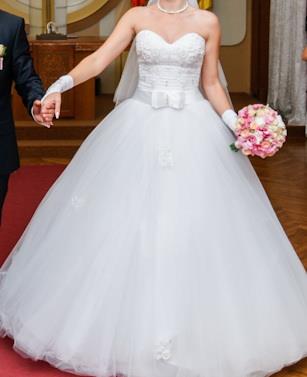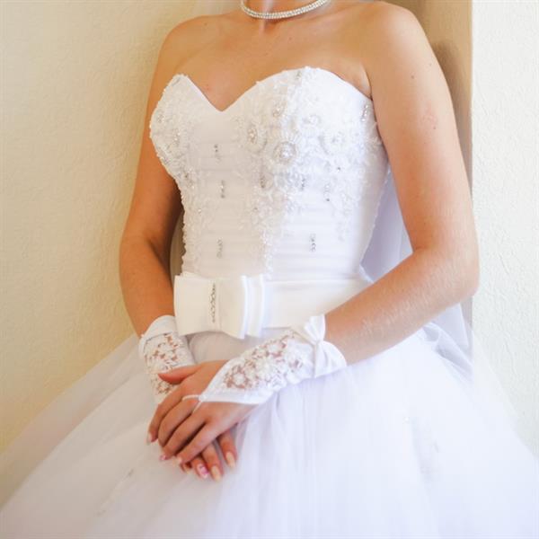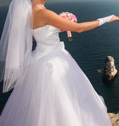 Белое платье, красивая вышивка со стразами на корсете. Удобное и не тяжелое. Размер 44-46. Сзади молния и шнуровка, корсет хорошо поддерживает грудь.