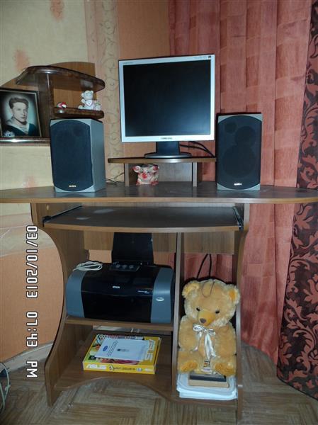 Края столешницы скруглены радиусами, что обеспечит большую безопасность и эстетичность изделия. Цвет – орех лесной. В комплекте – подставка под монитор (переносная). Имеется полка под клавиатуру, системный блок, принтер.