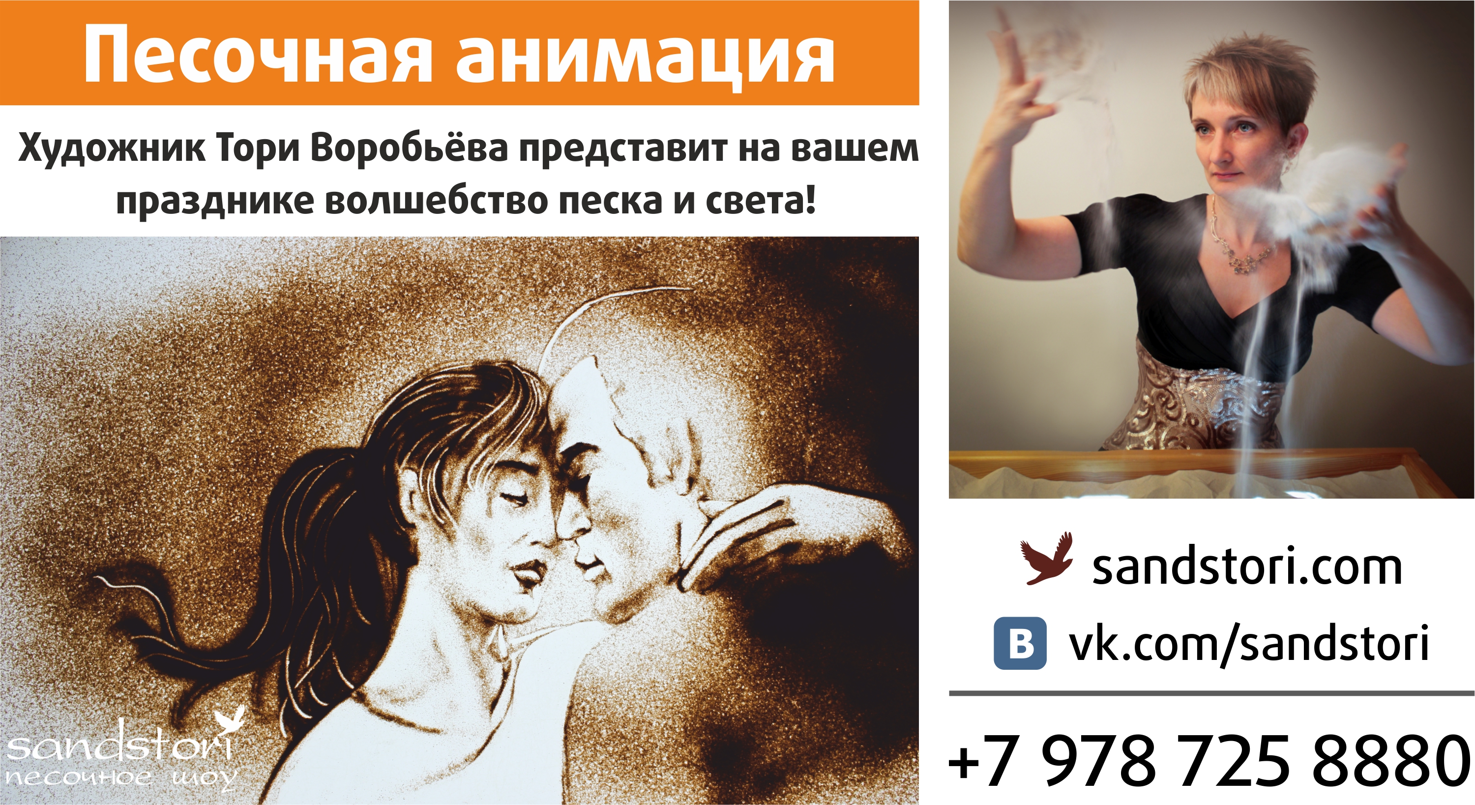 Художник песочной анимации Тори Воробьёва с радостью познакомит Вас с этим удивительным современным видом искусства - магией песка и света!