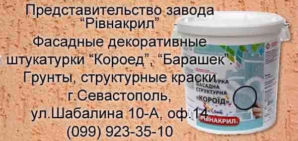 Акриловая декоративная фасадная штукатурка "Короед", "Барашек". По германской технологии, производство "Ривнакрил" Украина. Готовая к нанесению штукатурка. Допускает колорирование без финишной покраски. Равномерная текстура и цвет. Сокращаются расходы на нанесение материал и отходы. Не сохнет в банке. Стойкая к внешним воздействиям погоды и истиранию. г. Севастополь, пр. Античный 4, оф. 24. +7(978) 78-88-353. fasadu.ucoz.ua