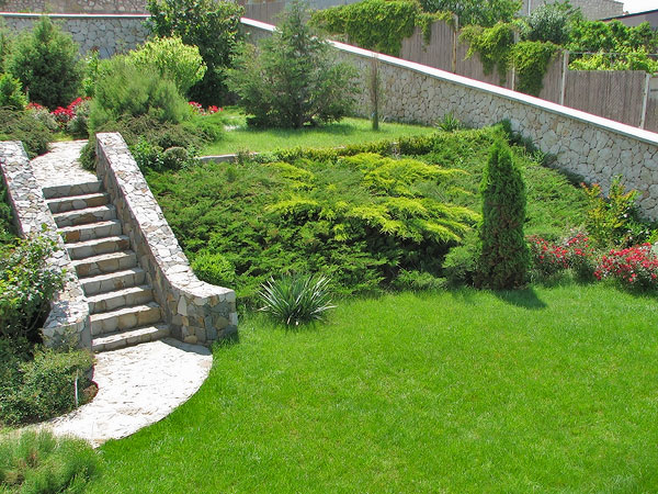 На территории парк- газоны, розы, цветы, вечнозелёные расстения. Всё в доме сделано из натурального камня и дерева.