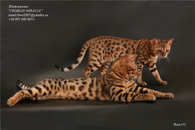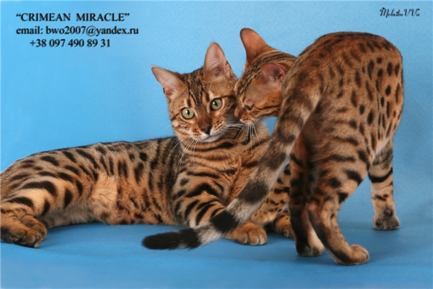 Питомник «CRIMEAN MIRACLE», регистрация WCF, предлагает к продаже элитных котят Бенгальской породы (домашний мини-леопард). Котята воспитанные, приучены к лотку и когтеточке. Доставка малышей осуществляется по всей территории Украины. Наш питомник предоставляет полную консультацию по воспитанию, кормлению и содержанию котят. У малышей полный комплект документов. Фото родителей Вы можете посмотреть на указанных фото ниже, фото деток на нашем сайте. Цена на котят договорная. Подробности по ссылке: http://www.crimean-miracle.com