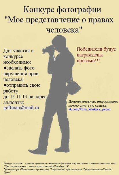 21 ноября в Севастополе состоится конкурс фотографий на тему " Мое представление о правах человек"Для участия в конкурсе необходимо сделать фото нарушения прав человека и до 15 ноября 2014 г. отправить свою работу на эл. адрес [email protected] Победителей ждут призы!