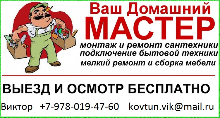 Домашний Мастер быстро, качественно и недорого выполнит любой вид мелкого ремонта. Установит и подключит сантехнику, заменит выключатель, розетку, люстру. Отремонтирует мебель. Установит, отрегулирует двери и окна. Заменит замки.А так же поможет с выбором материалов для ремонта. У Вас что то сломалось? Звоните! Мы поможем!!! Вызов мастера и консультации бесплатно. Пенсионерам скидки!!!