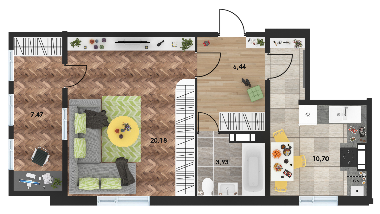 Однокомнатная квартира общей площадью 45 кв.м, комната 20 кв.м на 2 окна с выходом на просторную застекленную лоджию 7,47 кв.м.