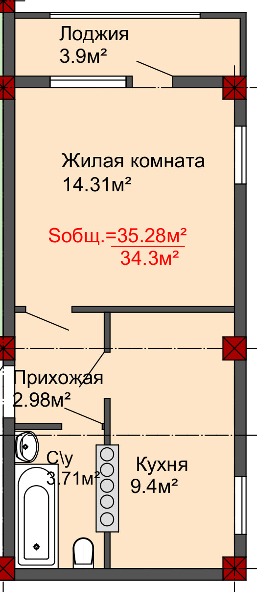 Квартира с видом на море.- 35,28 м2. Индивидуальная планировка,по вашему желанию,панорамное остекление лоджии.
