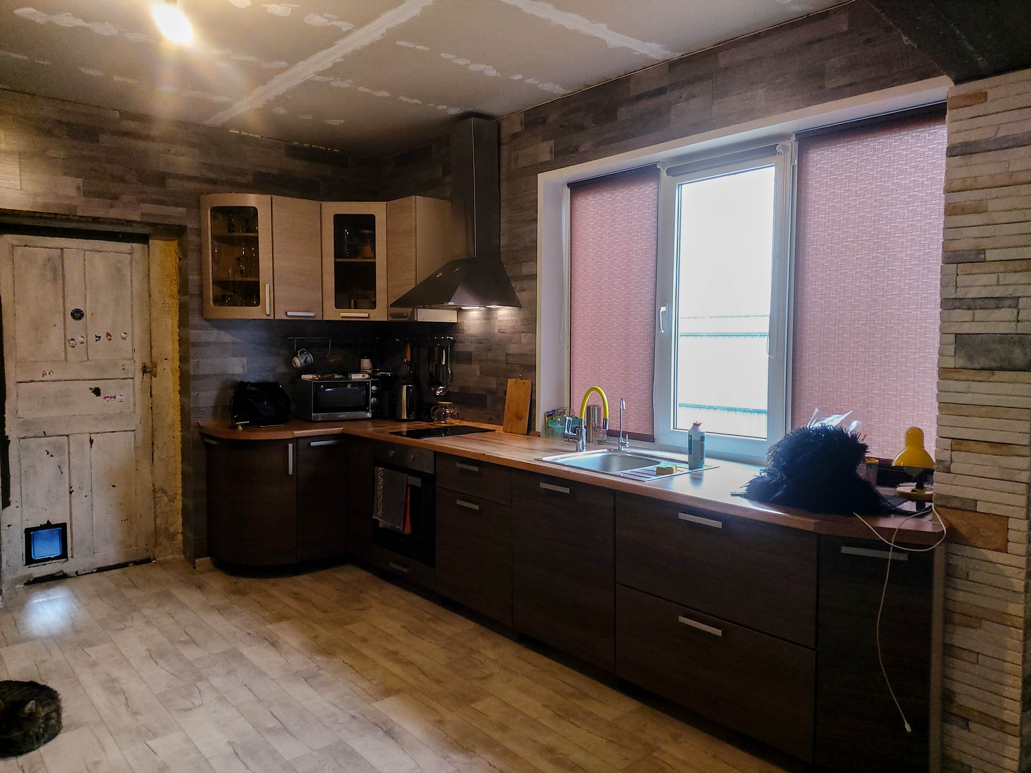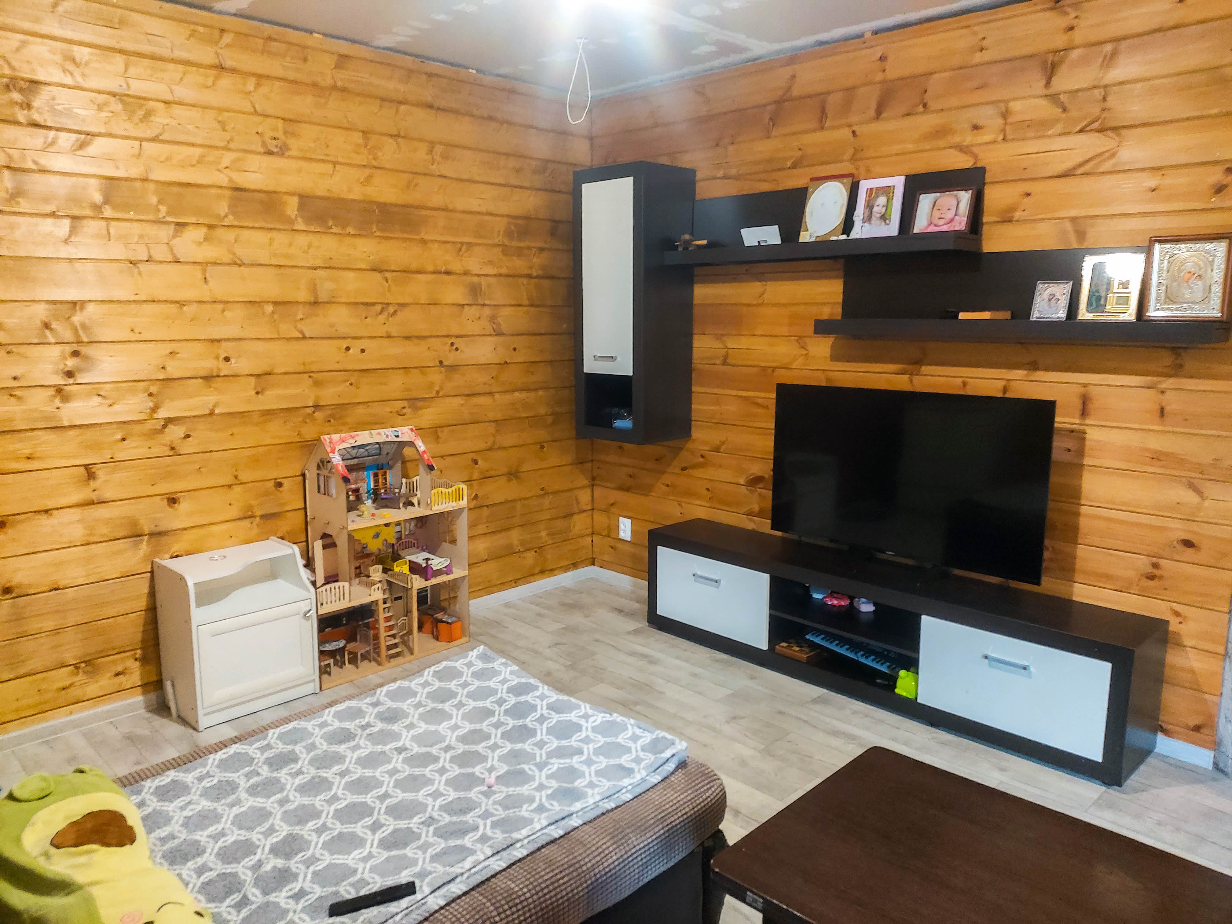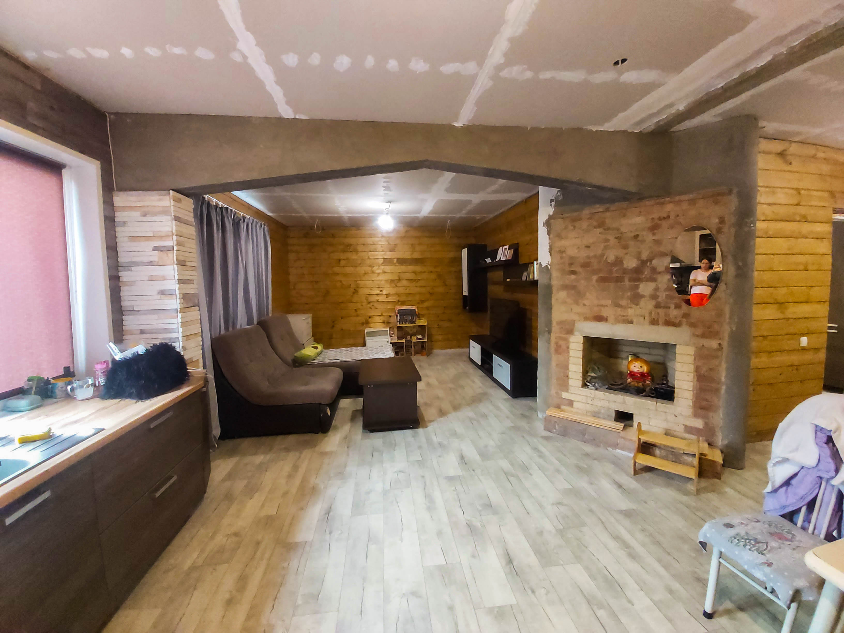 На 1 этаже расположены гостиная, холл и сан. узел. На 2 этаже выполнен проект под 3 комнаты и большой балкон. На 1 этаже выполнен ремонт и отделка, остается мебель и техника, можно заехать и жить. На 2 этаж ведет лестница, весь этаж в черновой отделке.