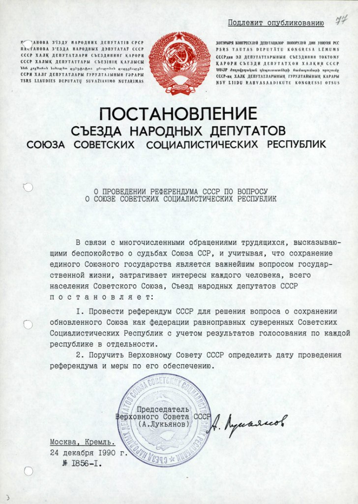СССР — ЕДИНОЕ СОЦИАЛИСТИЧЕСКОЕ ГОСУДАРСТВО СОГЛАСНО РЕШЕНИЯ НА РЕФЕРЕНДУМЕ СССР ОТ 17.03.1991 Г.
