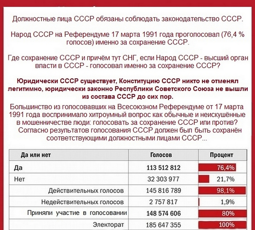 МОЖЕТ ЛИ ЗАКОННО ХОТЬ ОДИН ЧИНОВНИК ЮРИДИЧЕСКИ СУЩЕСТВУЮЩЕГО ДО НАСТОЯЩЕГО ВРЕМЕНИ СОЮЗА СОВЕТСКИХ СОЦИАЛИСТИЧЕСКИХ РЕСПУБЛИК ЛИШИТЬ ВСЕХ ГРАЖДАН СССР ГРАЖДАНСТВА ЭТОЙ ЕДИНОЙ СТРАНЫ, ТЕРРИТОРИИ ЭТОГО ЕДИНОГО СОЦИАЛИСТИЧЕСКОГО ГОСУДАРСТВА, ЛИШИТЬ СОЗДАННОГО ТРУДОМ ЭТИХ ГРАЖДАН ИМУЩЕСТВА ЭТОГО ВЕЛИКОГО ГОСУДАРСТВА, ЛИШИТЬ ГРАЖДАН ПАСПОРТОВ СССР, ИЗМЕНИТЬ СОЦИАЛИСТИЧЕСКИЙ СТРОЙ НА ПОЧТИ ФЕОДАЛЬНО-ГЕНОЦИДНО-КАПИТАЛИСТИЧЕСКИЙ, ДЕСТРУКТИВНО ИЗМЕНИТЬ МЕХАНИЗМ УПРАВЛЕНИЯ ЕДИНОЙ СТРАНОЙ, ЕСЛИ НА РЕФЕРЕНДУМЕ СССР ОТ 17.03.1991 г. (РЕШЕНИЕ КОТОРОГО ИМЕЕТ БОЛЕЕ ВЫСОКУЮ ЮРИДИЧЕСКУЮ СИЛУ И ПОСЛЕДУЮЩИЕ НОРМАТИВНО-ПРАВОВЫЕ АКТЫ НЕ ДОЛЖНЫ ПРОТИВОРЕЧИТЬ ЕМУ) БОЛЬШИНСТВОМ ГОЛОСОВ ГРАЖДАНЕ ЭТОЙ ЕДИНОЙ СТРАНЫ ПРОГОЛОСОВАЛИ ЗА СССР, А НЕ ЗА ЕГО "РАЗВАЛ" И РАСТАСКИВАНИЕ «ПО КАРМАНАМ» ЧИНОВНИКОВ ИМУЩЕСТВА ГРАЖДАН СОВЕТСКОГО СОЮЗА - РАБОТОДАТЕЛЯ ЭТИХ ЧИНОВНИКОВ?