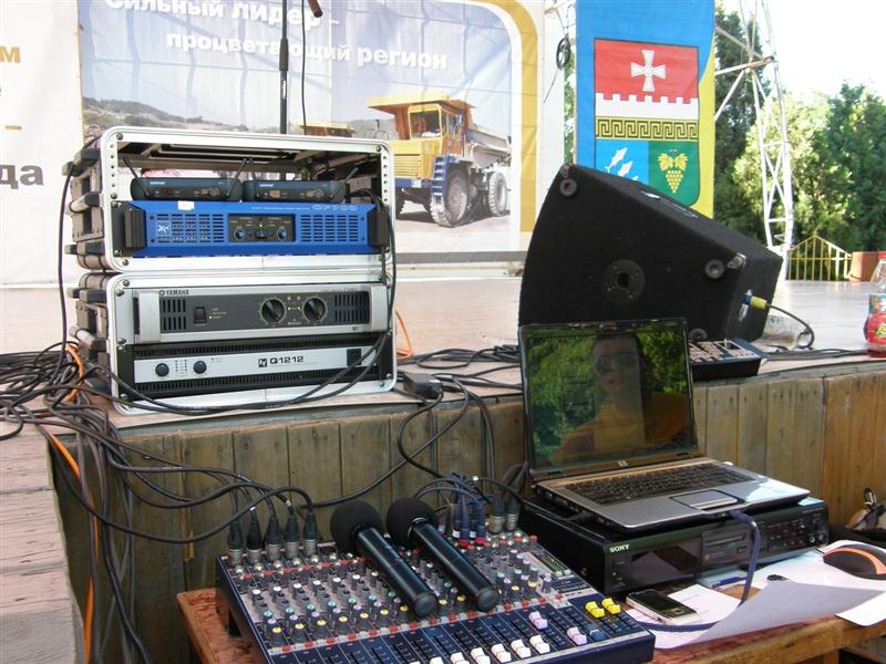 Комплект оборудования: акустическая система "JBL", мощностью 2300 Вт (4 колонки, усилители YAMAHA, PARK), микшерный пульт "Soundcraft" (12 ch.), голосовая обработка "Lexicon", 2-6 шнуровых или радиомикрофона "Shure SM58, BETA58, SM87" серии PGX и SLX, компрессоры "DBX", мастер-эквалайзер "DBX", MD-дека "Sony", ноутбук, микрофонные стойки. По необходимости - 6 динамических (или управляемых) световых приборов.