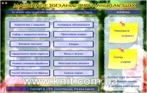 Но, самое главное, это не сухой теоретический материал с черно-белыми фотографиями, это качественное видео и приятный инструктор с которым Вы будете постигать азы машинного вязания.