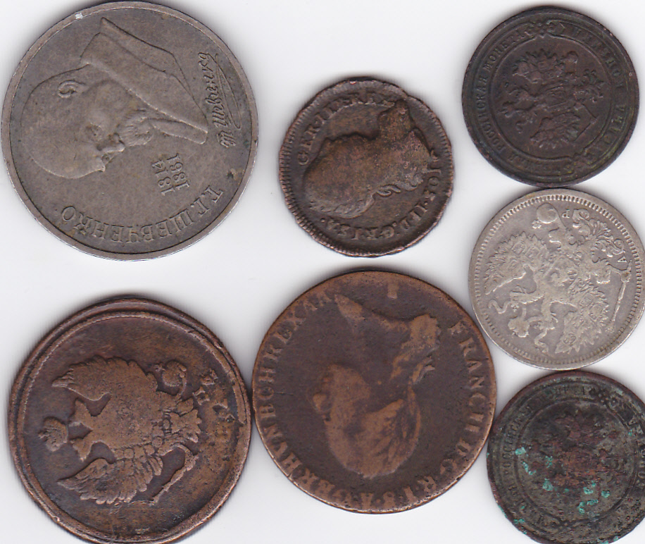 20 копеек-1905г. 1 копейка-1903г. 1рубль1814г.2копейки -1814г. 3франка 1800г. генрих-1775г. 1копейка-1912год